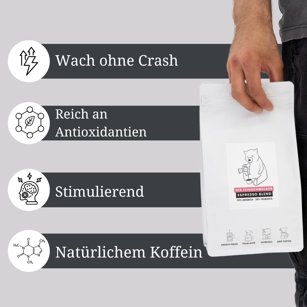 Mach dir keine Sorgen um Bitterkeit oder flachen Geschmack – bei uns bekommst du konstant volles Aroma, eine samtige Crema und harmonischen Genuss. Und das Beste: Unser Kaffee passt auch perfekt zu pflanzlichen Milchalternativen wie Hafer-, Mandel- oder Sojamilch.