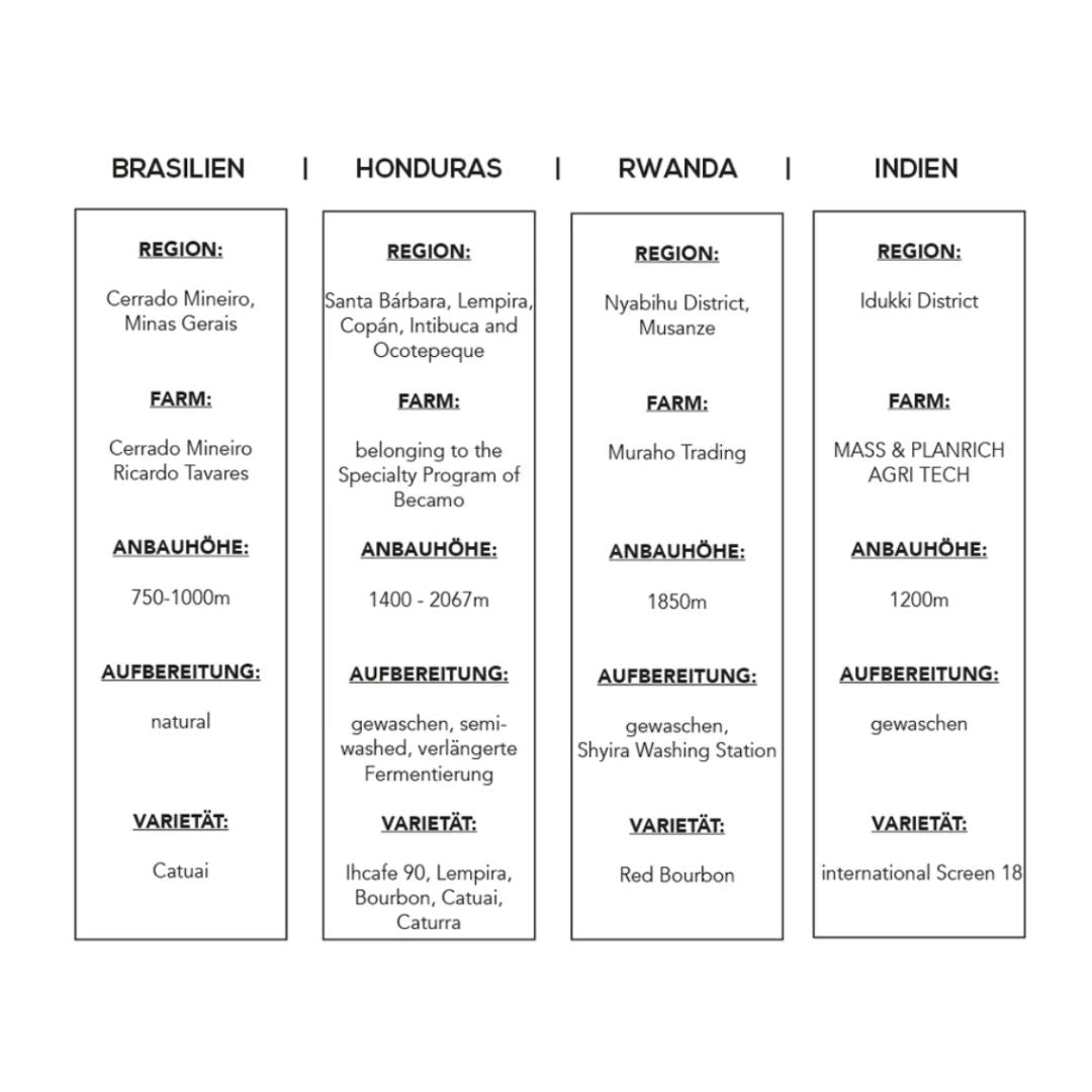 - Herkunft: 🇧🇷 Brasilien, 🇭🇳 Honduras, 🇷🇼 Ruanda, 🇮🇳 Indien